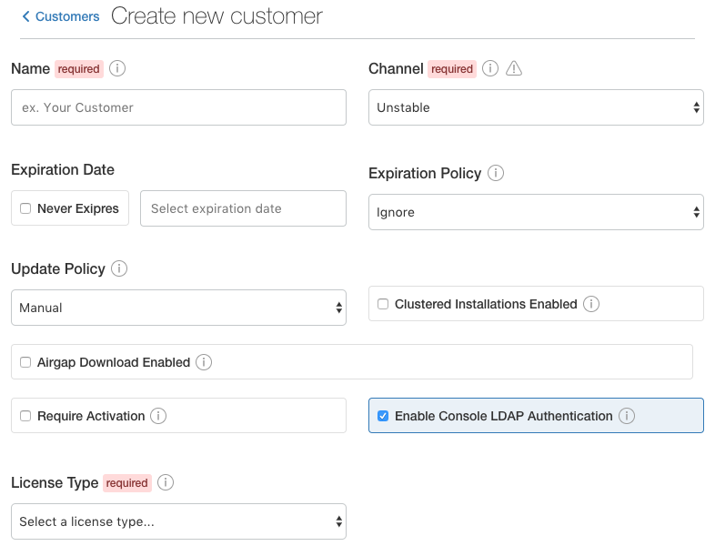 When you create a license you’ll need to assign it to at least one release channel. Stable channel is intended to be used for production installations. Unstable and Beta channels are intended for internal testing. More about release channel management.